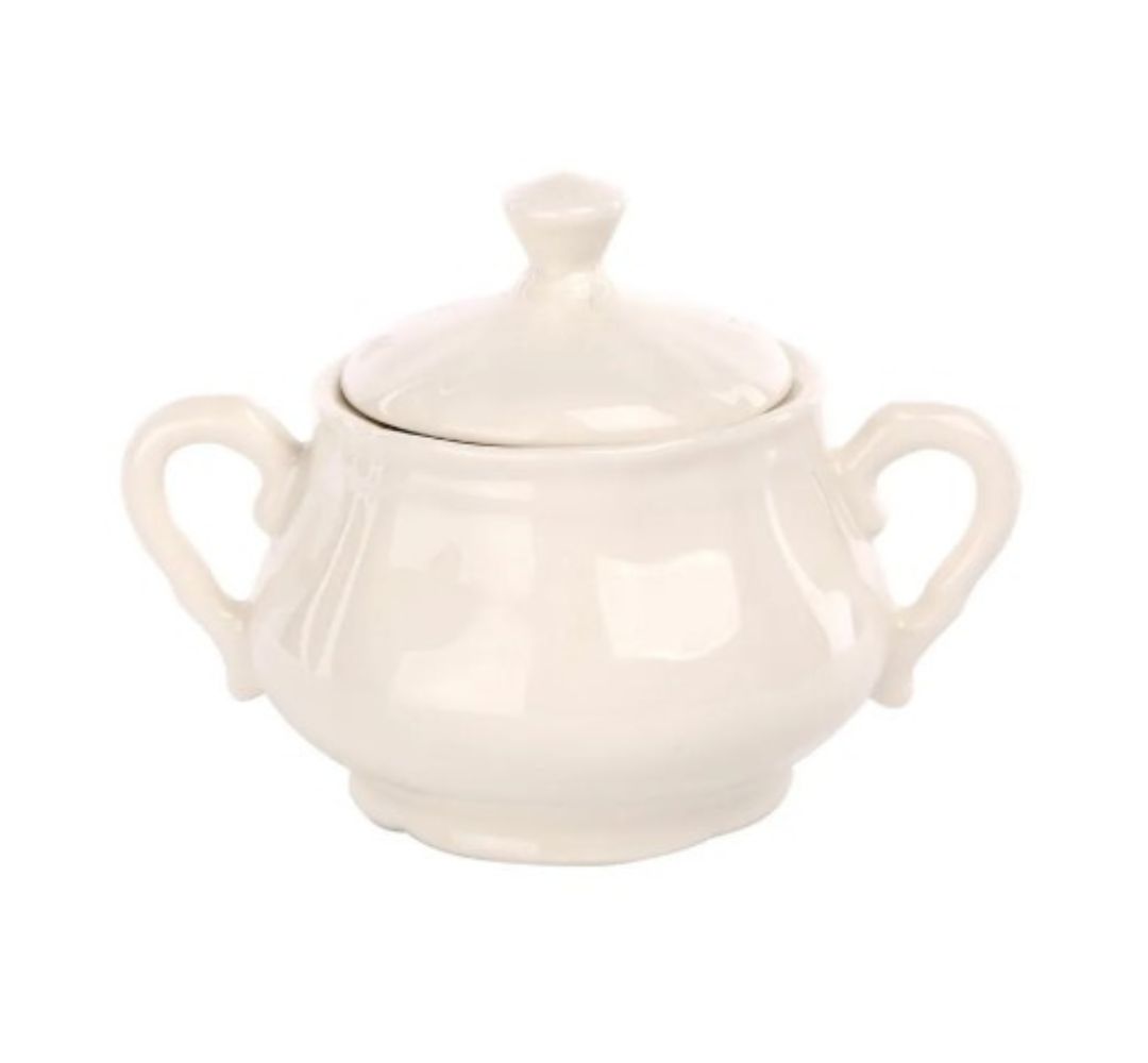 Cukiernica w stylu retro wykonana z porcelany w ciepłym kremowym kolorze. Posiada subtelne reliefy podkreślające jej kształt i misterne rzeźbienia przy uszku. Doskonale sprawdzi się przede wszystkim w gastronomii, chodź z powodzeniem może pełnić rolę zastawy domowej.