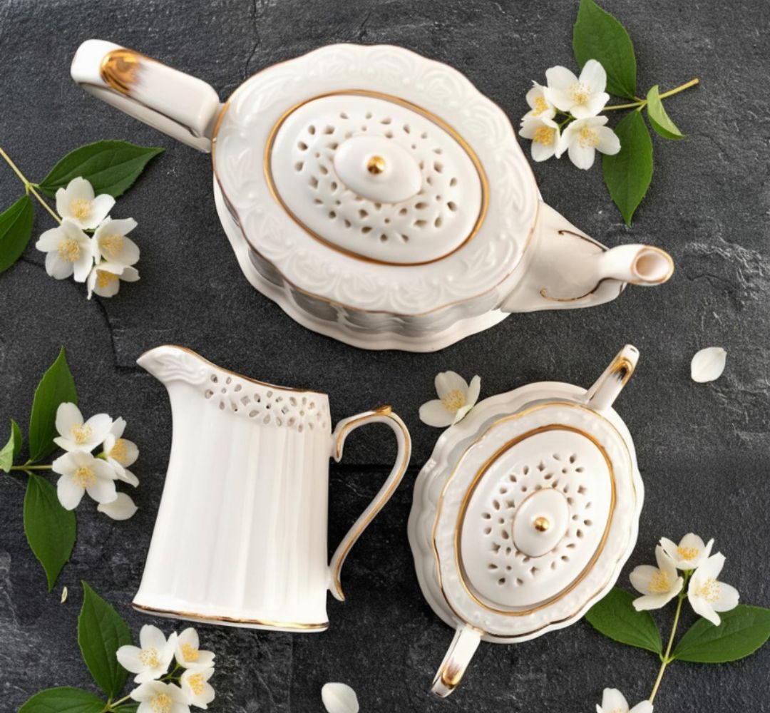 Dodatkowo, dzbankowi towarzyszy misterna ażurowa koronka, która została wycinana ręcznie, oraz eleganckie stopki filiżanek i kubeczków, co nadaje całości lekkości i finezji.