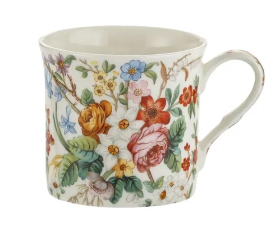 Kubek 300ml z porcelany bone china ozdobiony motywem kwiatowym. Jego pojemność idealnie sprawdzi się do parzenia kawy i herbaty.