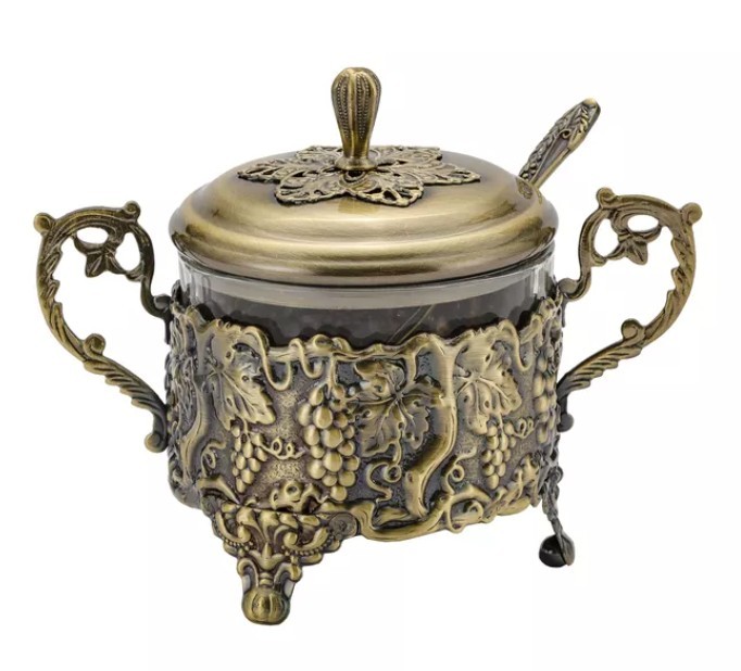 Przepiękna cukiernica z łyżeczką. Wykonana z wysokiej jakości metalu, którego zewnętrzna powłoka została poddana platerowaniu.