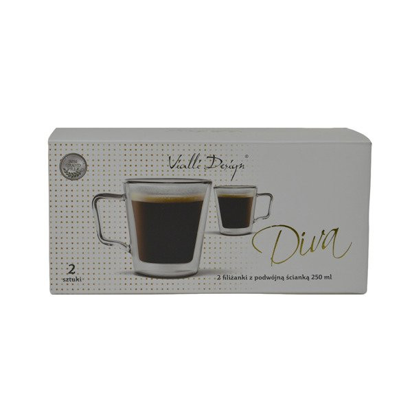 Komplet dwóch szklanek marki Vialli Design wykonanych ze szkła żaroodpornego, borokrzemowego. Szklanki wykonane są w technologii Double Wall. Zastosowanie podwójnych ścianek ze szkła żaroodpornego sprawia, że napój wewnątrz naczynia dłużej zachowuje swoją temperaturę, a zewnątrzna część nie parzy w dłoń.