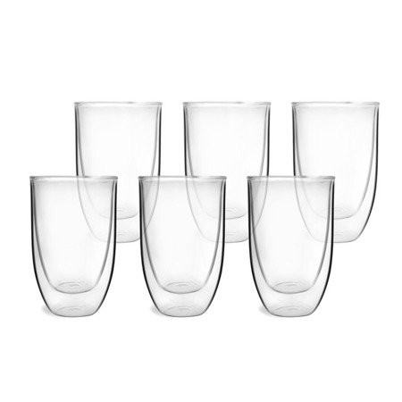 Komplet sześciu termicznych szklanek z podwójnymi ściankami o pojemności 350 ml marki Vialli Design wykonanych ze szkła żaroodpornego, borokrzemowego. Szklanki wykonane są w technologii podwójnych ścianek. Dzięki zastosowaniu podwójnych ścianek Twój napój wewnątrz naczynia dłużej zachowuje swoją temperaturę, a zewnętrzna część nie parzy w dłonie.