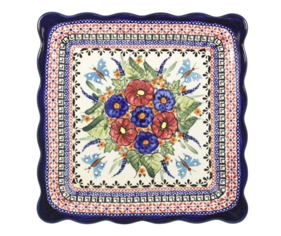 Talerz kwadratowy od Zakładów Ceramicznych Bolesławiec, w dekoracji artystycznej. Charakteryzuje się większą, niż pozostałe dekoracje, ilością wzorów i kolorów. W przypadku tej dekoracji mamy motyle latające nad łąką oraz dopełnienie w postaci różnorodnych wzorów dookoła naczynia.