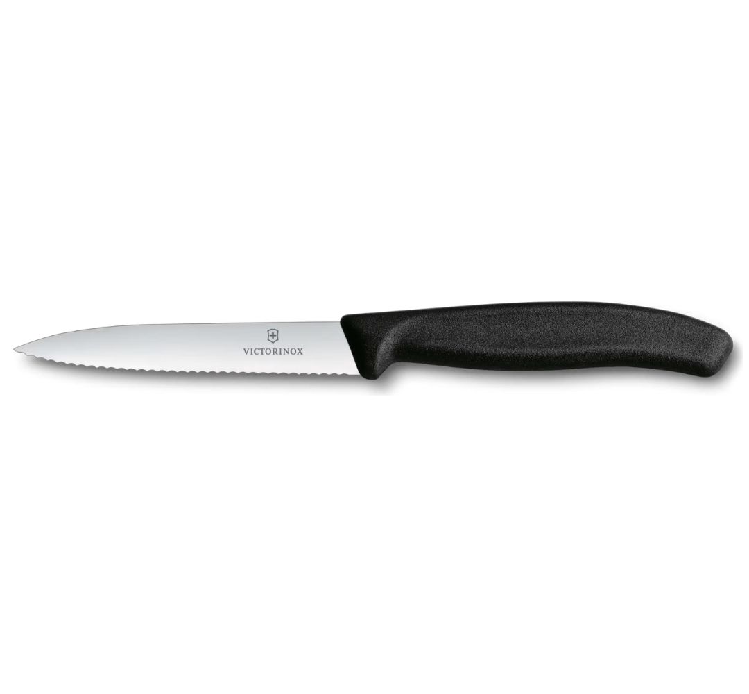 Nóż krojenia owoców i warzyw z ostrą krawędzią i ząbkowanym ostrzem o długości 10 cm.