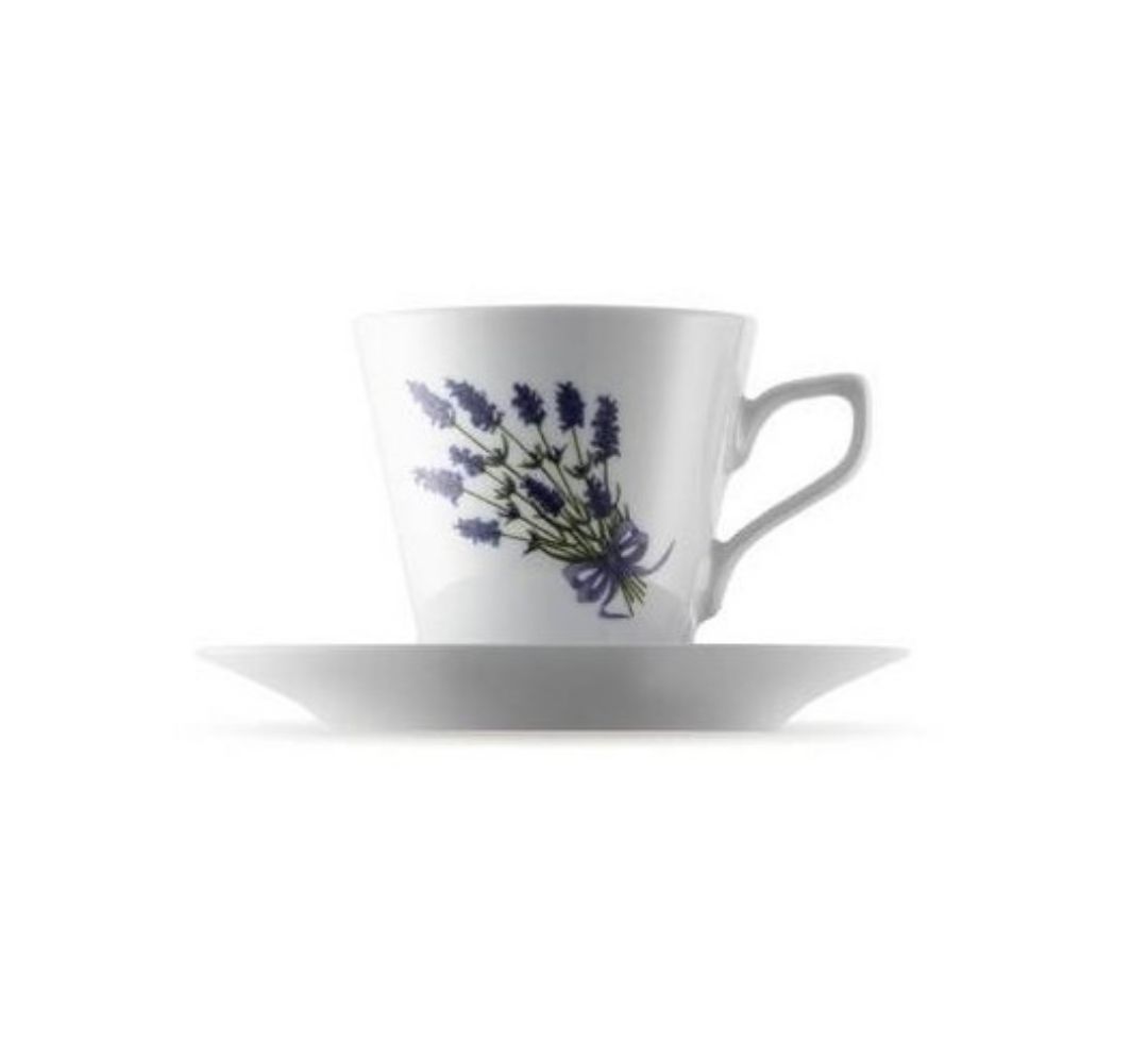 Filiżanka o pojemności 250 ml ze spodkiem o średnicy 15,5 cm. Wykonana z białej porcelany, dekorowana motywem lawendy.