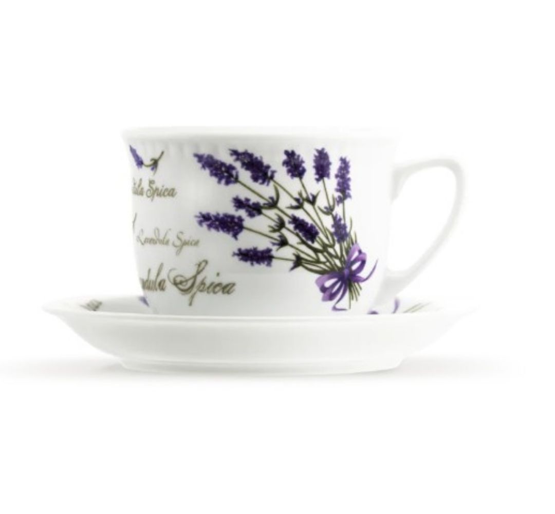 Porcelanowy kubek o pojemności 300 ml ze spodkiem. W kubku podasz większą kawę np. cappuccino lub herbatę. Kolekcja Lawenda jest to kolekcja, która przywołuje uśmiech na twarzy. Stworzona została z myślą o osobach, które cenią sobie spokój i odprężenie. Sprawdzi się zarówno podczas rodzinnych przyjęć w domu jak również podczas grilla z przyjaciółmi.