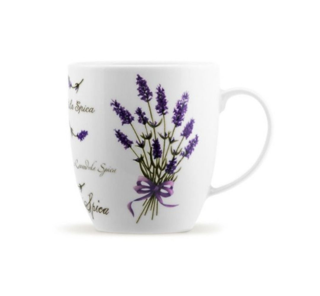 Porcelanowy kubek o pojemności 380 ml. Wykonany z białej porcelany, zdobiony motywem Lawendy.