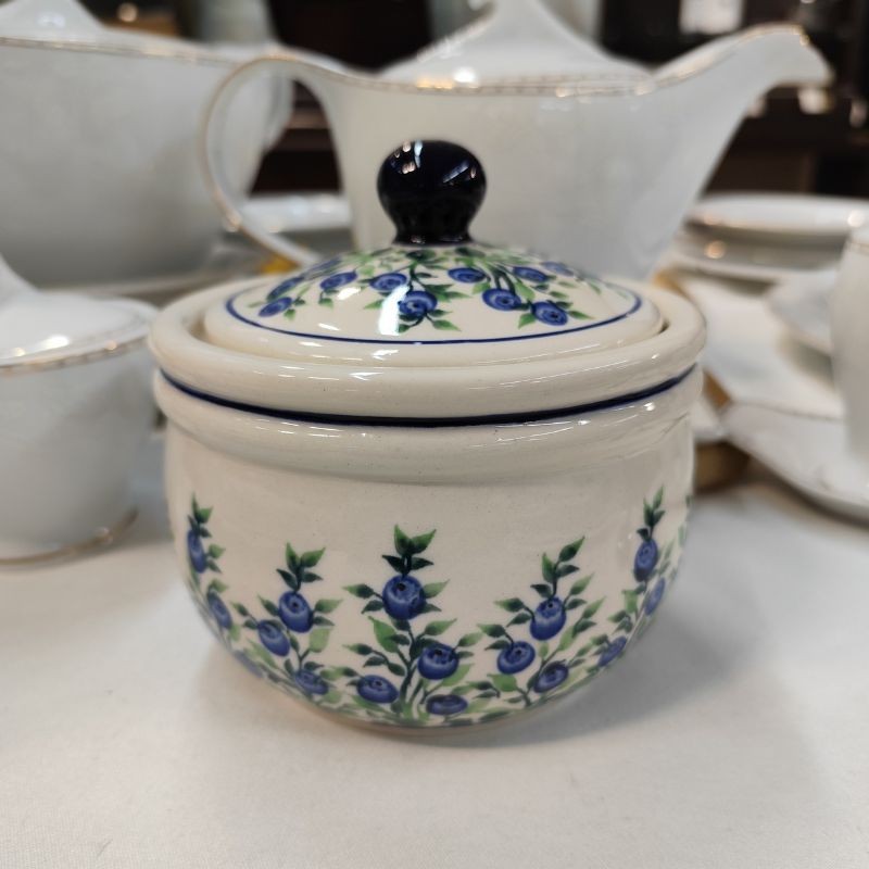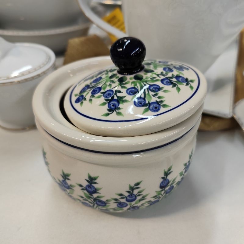 Dekoracja 1208 – Jagody to jedna z klasycznych dekoracji Bolesławca nawiązująca do dawnych, tradycyjnych motywów. Stworzona za pomocą pędzla i stempli, jej głównym elementem są jagody w barwach kobaltu i zieleni.