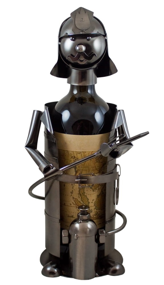 Stojak na butelkę w kształcie strażaka trzymającego wąż gaśniczy. Stojak wykonany został z najwyższej jakości stali. Przystosowany do różnej wysokości butelek, których średnica nie przekracza 7,7 cm. Produkt pakowany jest w białe, kartonowe pudełko.
