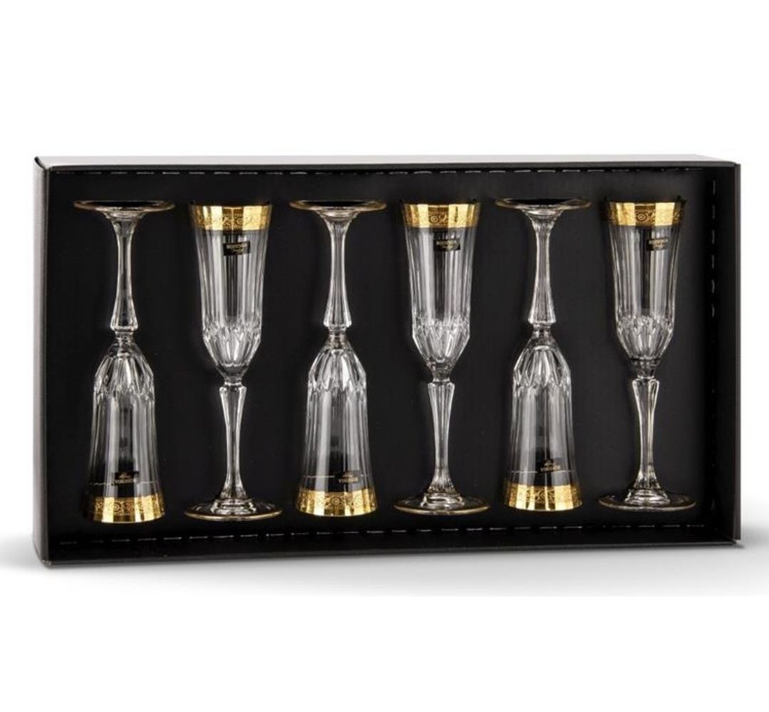 Zapewnij sobie wyjątkowy element elegancji na swoim stole dzięki kieliszkom do szampana z linii MIRADOR, które zachwycają złotą dekoracją. Idealne nie tylko dla siebie, ale także jako prezent, kieliszki te są niezwykle piękne i wyjątkowe. Pakowane w eleganckie opakowanie w kolorze czarnym z sygnowanym złotym logo Bohemia Prestige, stanowią nie tylko estetyczny dodatek, ale także wyraz ekskluzywności.