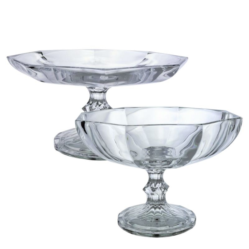 Komplet owocarek na nodze i patera na nodze wykonanych z krystaliny. Doskonale nadadzą się do ciastek i owoców. Producentem jest polska huta szkła IRENA.