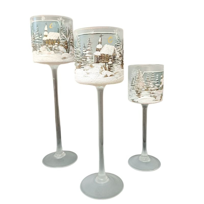 Pejzaż zimowy na szronionym szkle wykończony farbą imitującą śnieg z połyskującymi drobinkami. Przy zapalonej świecy szkła są bardzo dobrze doświetlone.