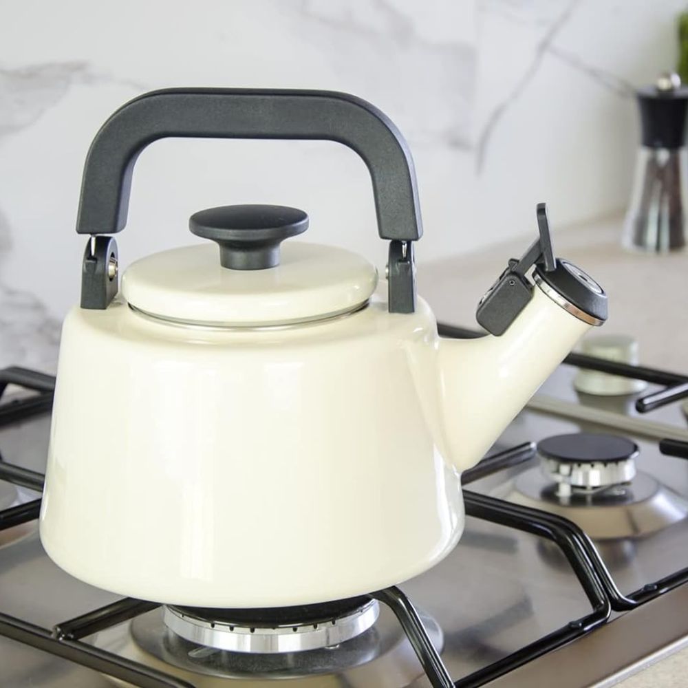 Wykonany z najwyższej jakości materiałów. Emalia jest nakładana ręcznie z dbałością o szczegóły. Czajnik wytwornie się prezentuje i zachwyca elegancją. Gwizdek unoszony mechanicznie można ustawić w pozycji otwartej (nie opada), co pozwala wlewać wodę do czajnika bez podnoszenia pokrywki.