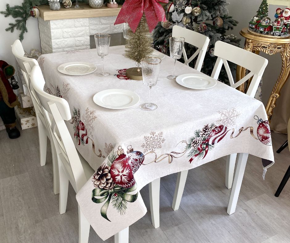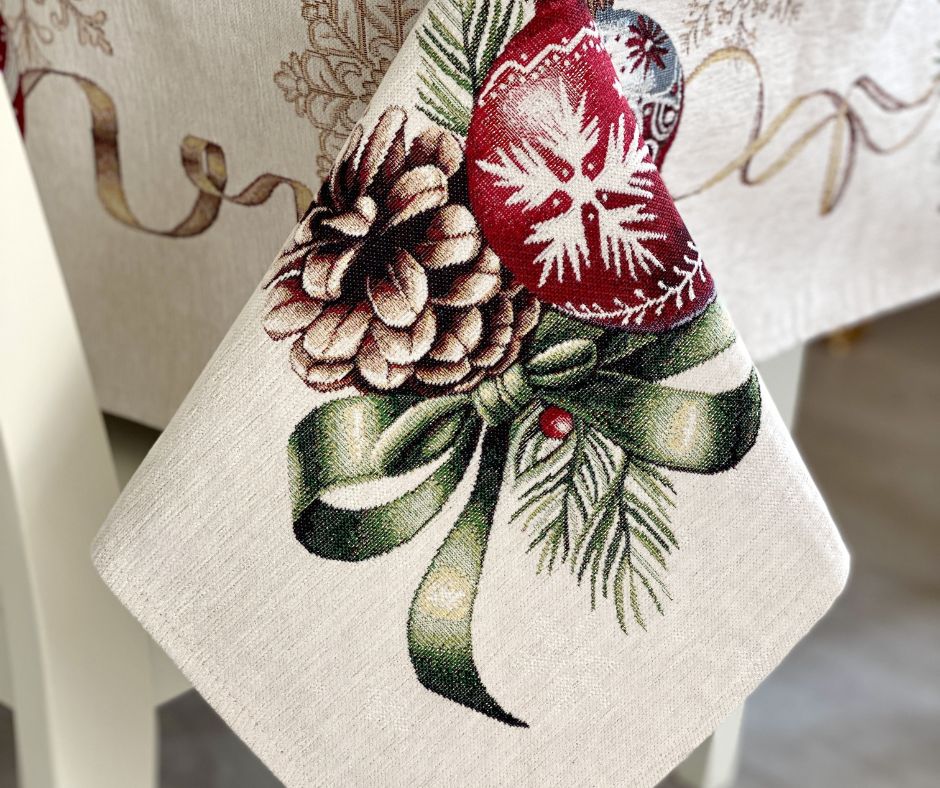Obrus noworoczny z pewnością stworzy przytulną i świąteczną atmosferę w Twoim domu, wprowadzi wyjątkowy nastrój Świąt Bożonarodzeniowych. Obrus wykonany jest z wytrzymałego materiału – gobelinu. Aby wybrać odpowiedni rozmiar obrusu, należy dodać 50-60 cm do długości i szerokości stołu. Wtedy obrus będzie zwisać o 25-30 cm ze wszystkich stron. Do obrusu można dobrać cały komplet gobelinów z tej samej kolekcji: podkładki na stół, bieżniki i poszewki dekoracyjne. Wyroby gobelinowe są przyjemne w dotyku, solidne i piękne. Mimo że obrus gobelinowy wygląda bardzo delikatnie, łatwa jest jego pielęgnacja. Produkt zachowuje swój kształt i kolor po praniu i prasowaniu. Obrus można używać na co dzień, można go prać w temperaturze +30°C.