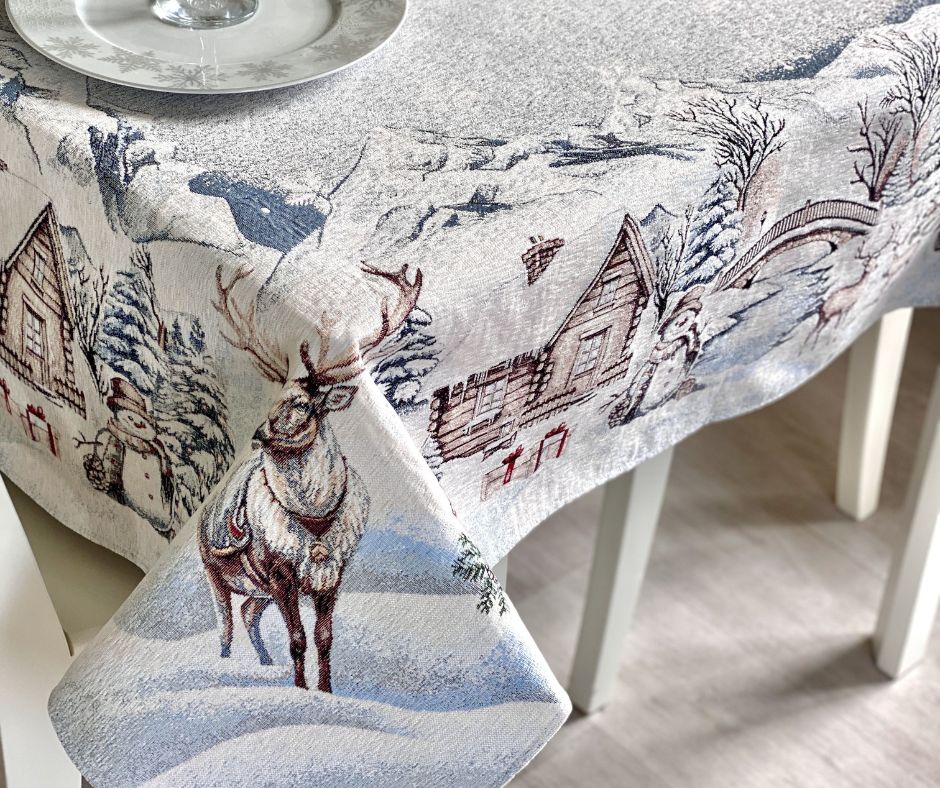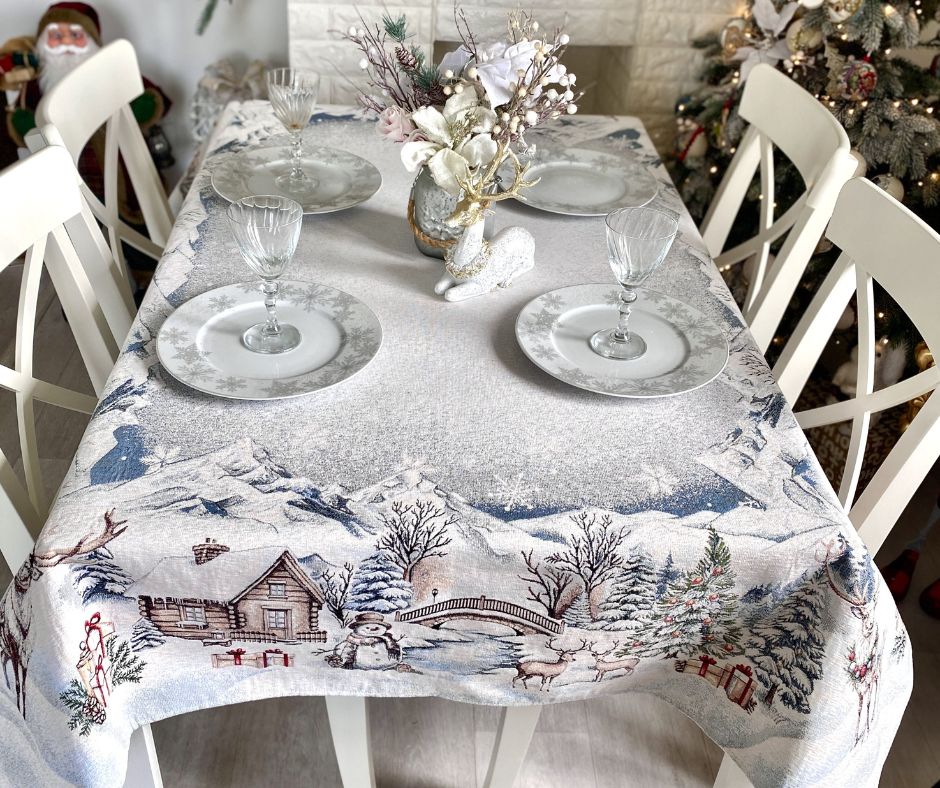 Obrus noworoczny z pewnością stworzy przytulną i świąteczną atmosferę w Twoim domu, wprowadzi wyjątkowy nastrój Świąt Bożonarodzeniowych. Obrus wykonany jest z wytrzymałego materiału – gobelinu. Aby wybrać odpowiedni rozmiar obrusu, należy dodać 50-60 cm do długości i szerokości stołu. Wtedy obrus będzie zwisać o 25-30 cm ze wszystkich stron. Do obrusu można dobrać cały komplet gobelinów z tej samej kolekcji: podkładki na stół, bieżniki i poszewki dekoracyjne. Wyroby gobelinowe są przyjemne w dotyku, solidne i piękne. Mimo że obrus gobelinowy wygląda bardzo delikatnie, łatwa jest jego pielęgnacja. Produkt zachowuje swój kształt i kolor po praniu i prasowaniu. Obrus można używać na co dzień, można go prać w temperaturze +30°C.