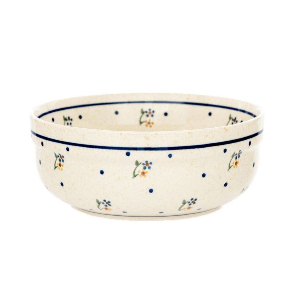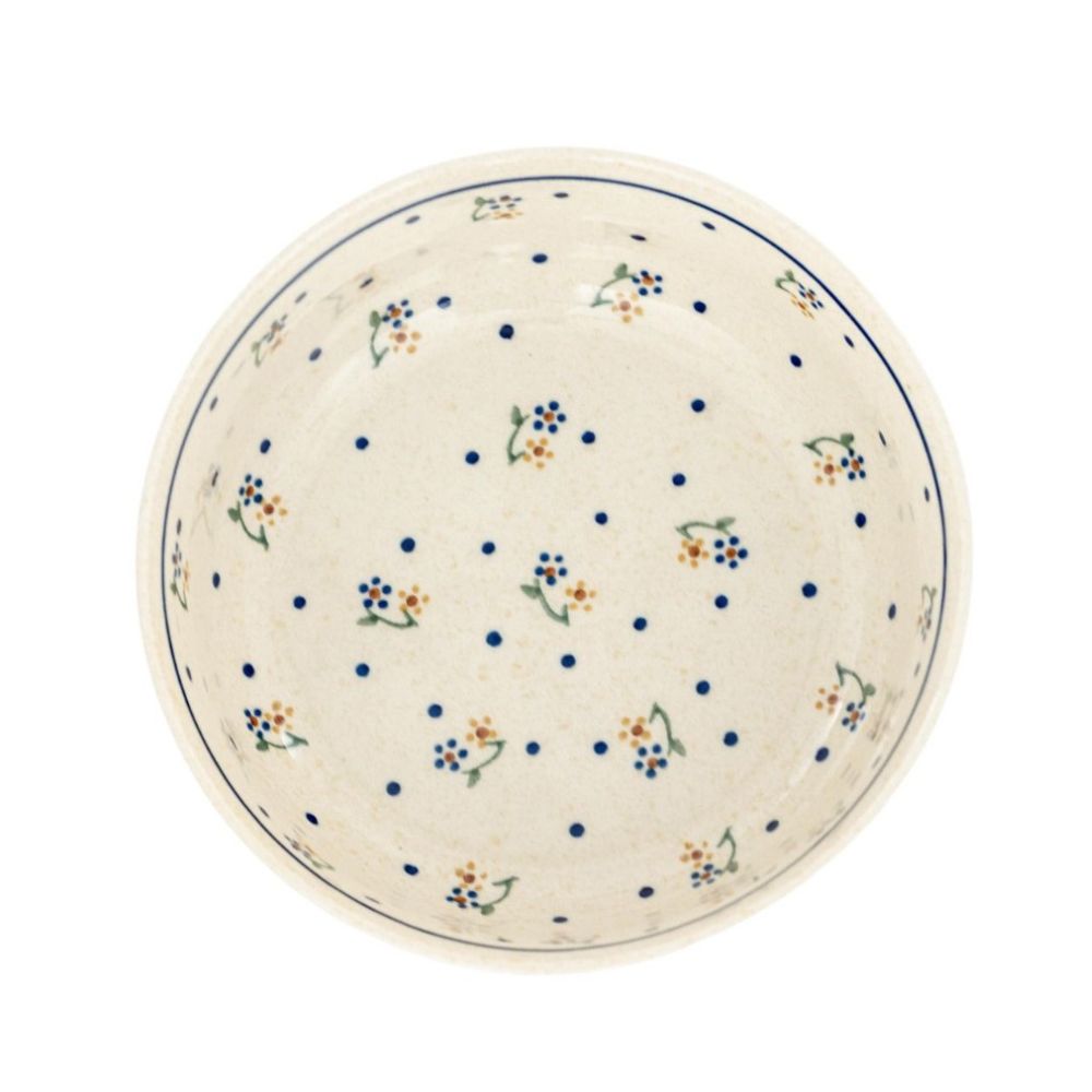 To jedna z klasycznych dekoracji ceramiki z Bolesławca, na której oczy pawie kiedyś stanowiły główny motyw dekoracyjny. Mamy tutaj kobaltowe koła z białymi środkami z kobaltowymi kropkami pośrodku, których brzegi przechodzą w kobaltową chmurę. Dodatek zieleni i brązu – kolejne tradycyjne kolory dekoracji – sprawia, że dekoracja staje się wizualnie jaśniejsza i bardziej interesująca.