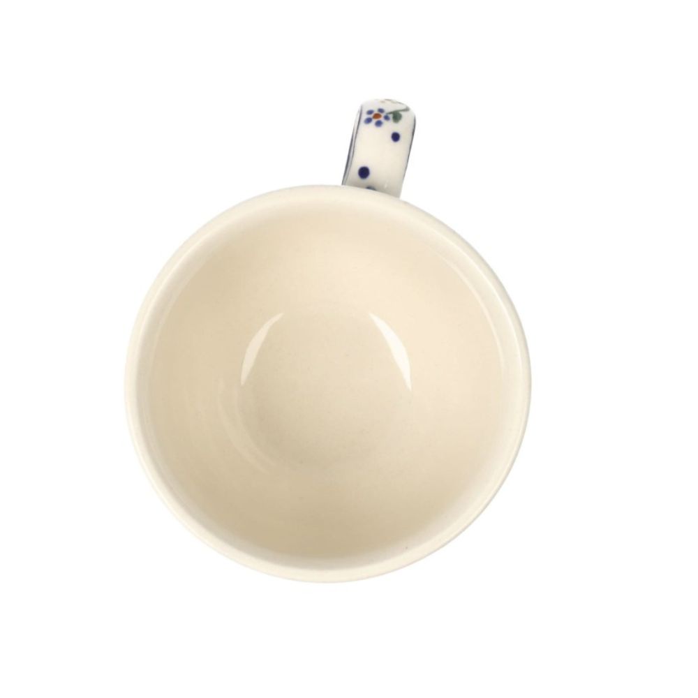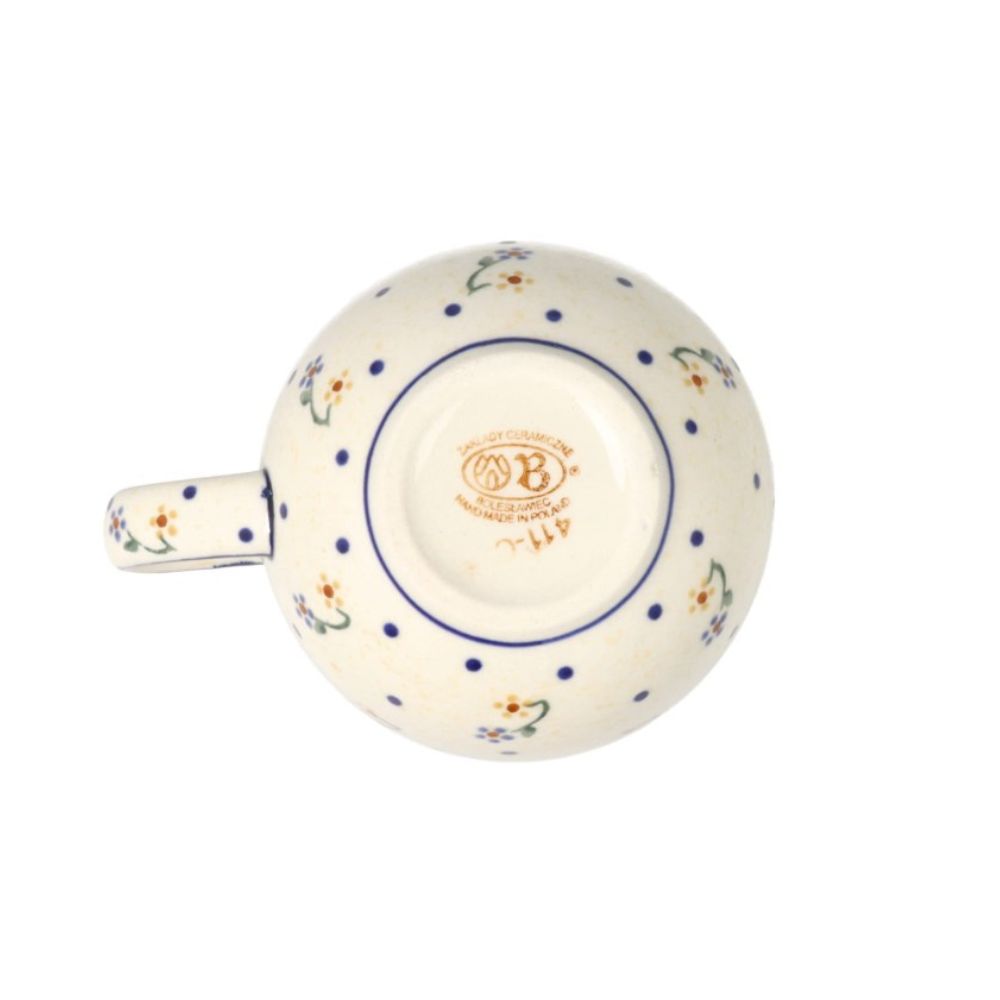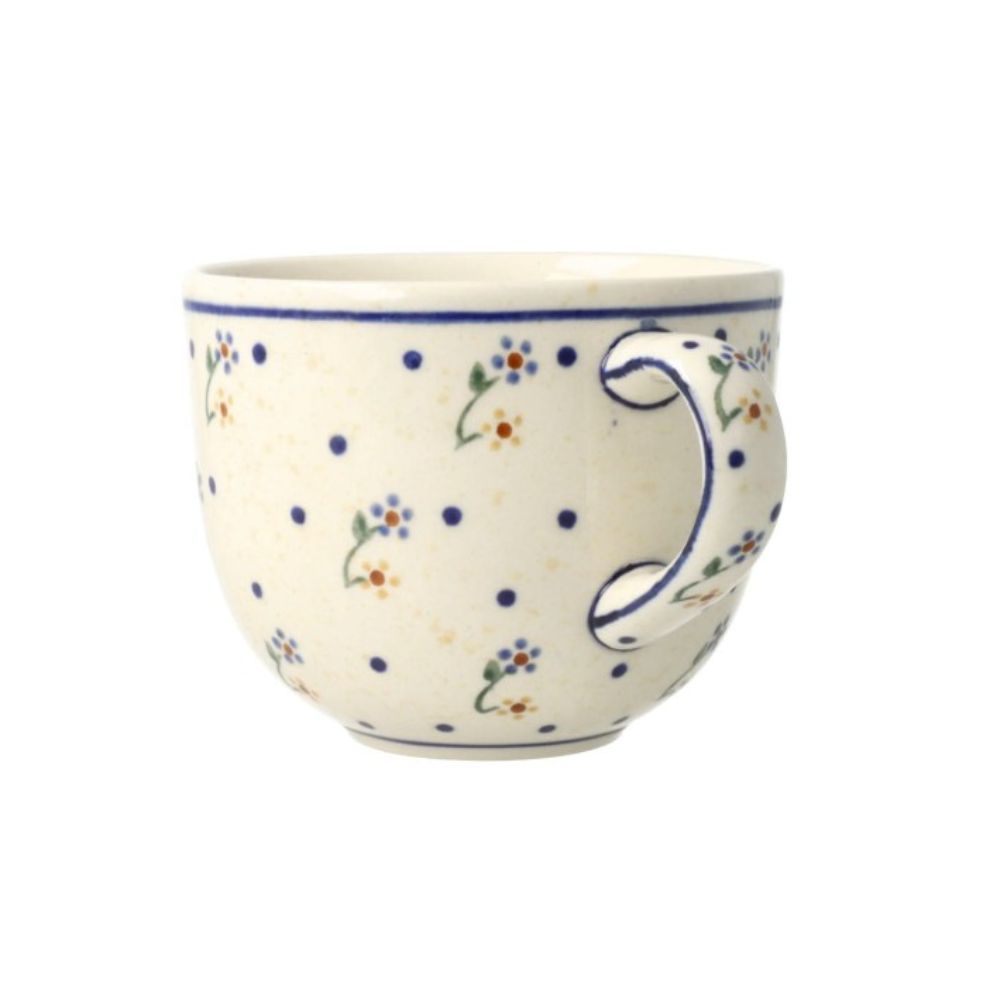 Filiżanka ceramiczna w dekoracji 111 od Zakładów Ceramicznych Bolesławiec. Dekoracja charakteryzuje się malutkimi kwiatkami, kobaltowymi kropkami oraz linią na obrzeżach. Po etapie malowania i szkliwienia produkt poddawany jest kolejnemu wypaleniu dzięki czemu zyskuje odporność na uszkodzenia i zmianę kolorów. Każdy produkt dekorowany jest ręcznie dlatego delikatne różnice w dekoracji są nieuniknione.