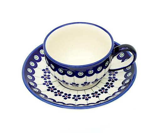 Ceramiczna filiżanka ze spodkiem o pojemności 210 ml, dekorowana ręcznie metodą stempelkową motywem w barwach kobaltu i błękitu.