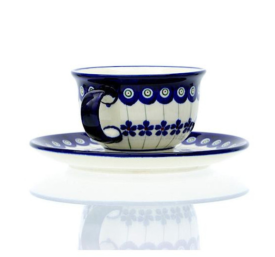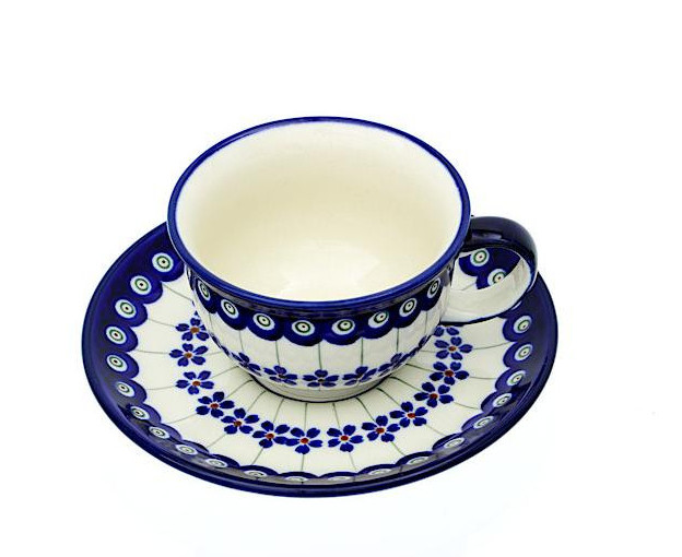 Ceramiczna filiżanka ze spodkiem o pojemności 220 ml, dekorowana ręcznie metodą stempelkową motywem w barwach kobaltu i błękitu.
