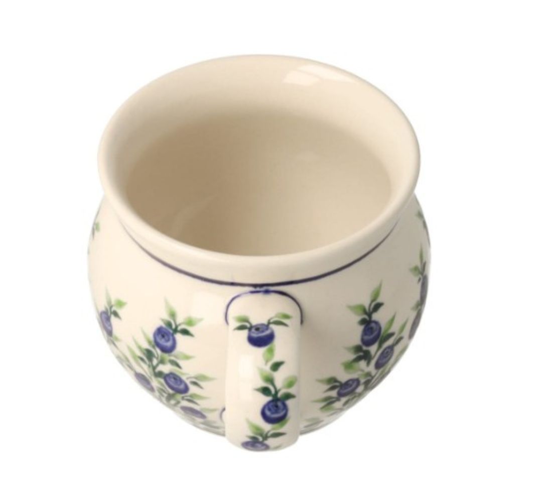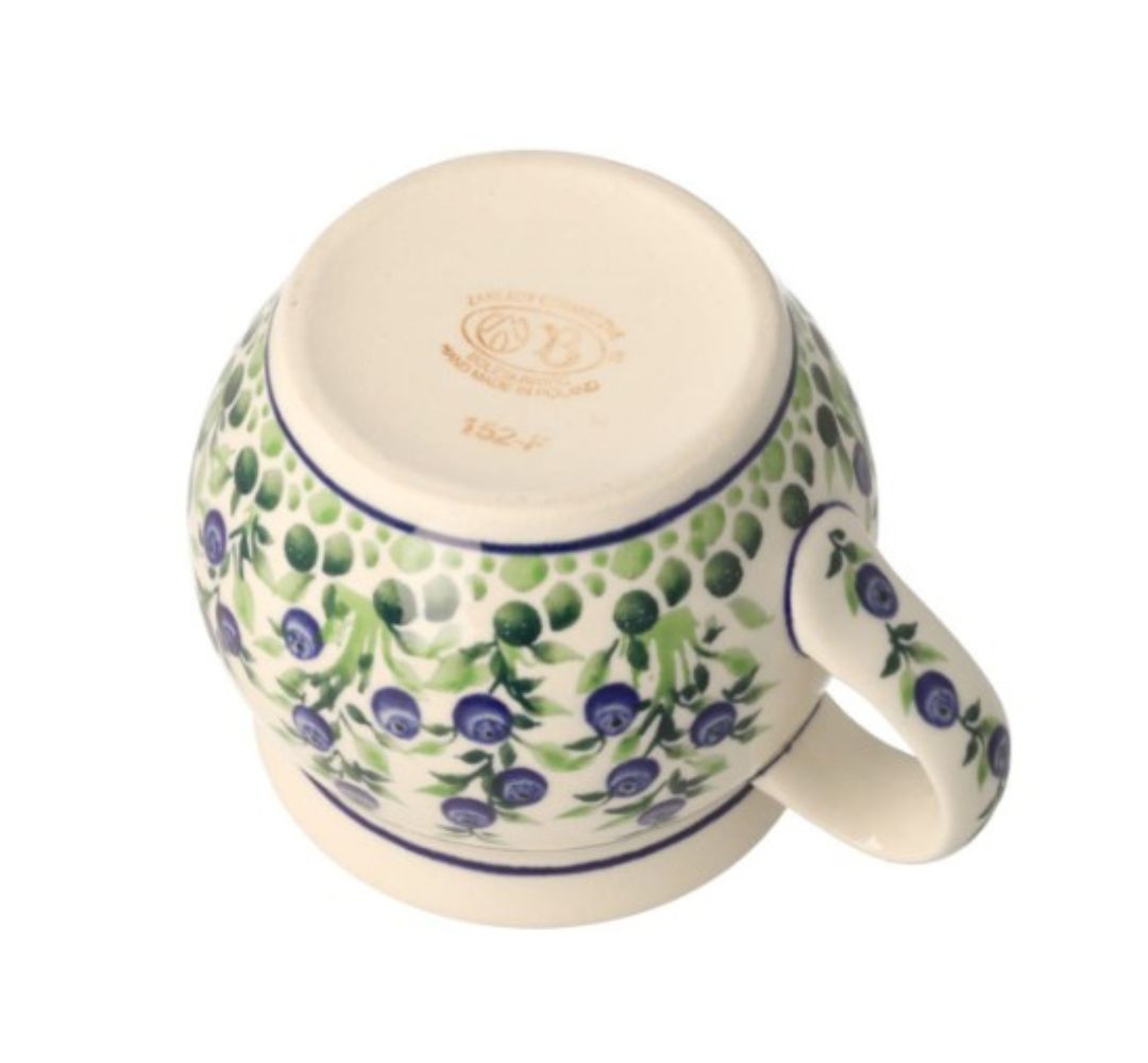 Ceramiczny kubek o pojemności 320 ml, dekorowany ręcznie metodą stempelkową motywem jagód.