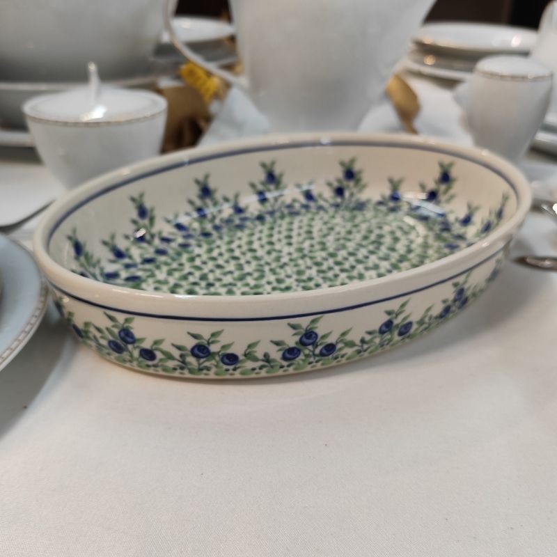 Dekoracja 1208 – Jagody to jedna z klasycznych dekoracji Bolesławca nawiązująca do dawnych, tradycyjnych motywów. Stworzona za pomocą pędzla i stempli, jej głównym elementem są jagody w barwach kobaltu i zieleni.