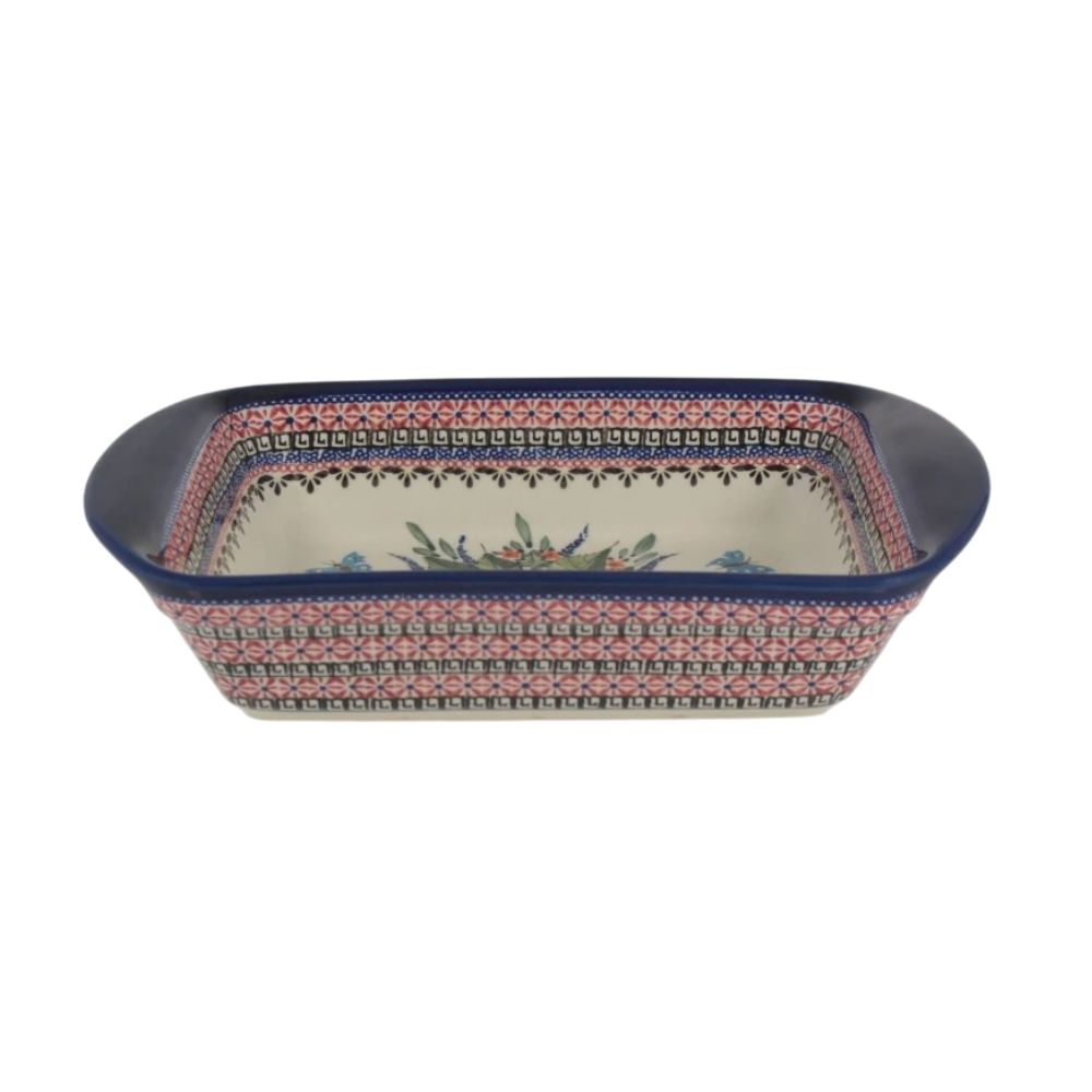 Półmisek prostokątny od Zakładów Ceramicznych Bolesławiec, w dekoracji artystycznej 149ART. Charakteryzuje się większą, niż pozostałe dekoracje, ilością wzorów i kolorów. W przypadku tej dekoracji mamy motyle latające nad łąką oraz dopełnienie w postaci różnorodnych wzorów dookoła naczynia.
