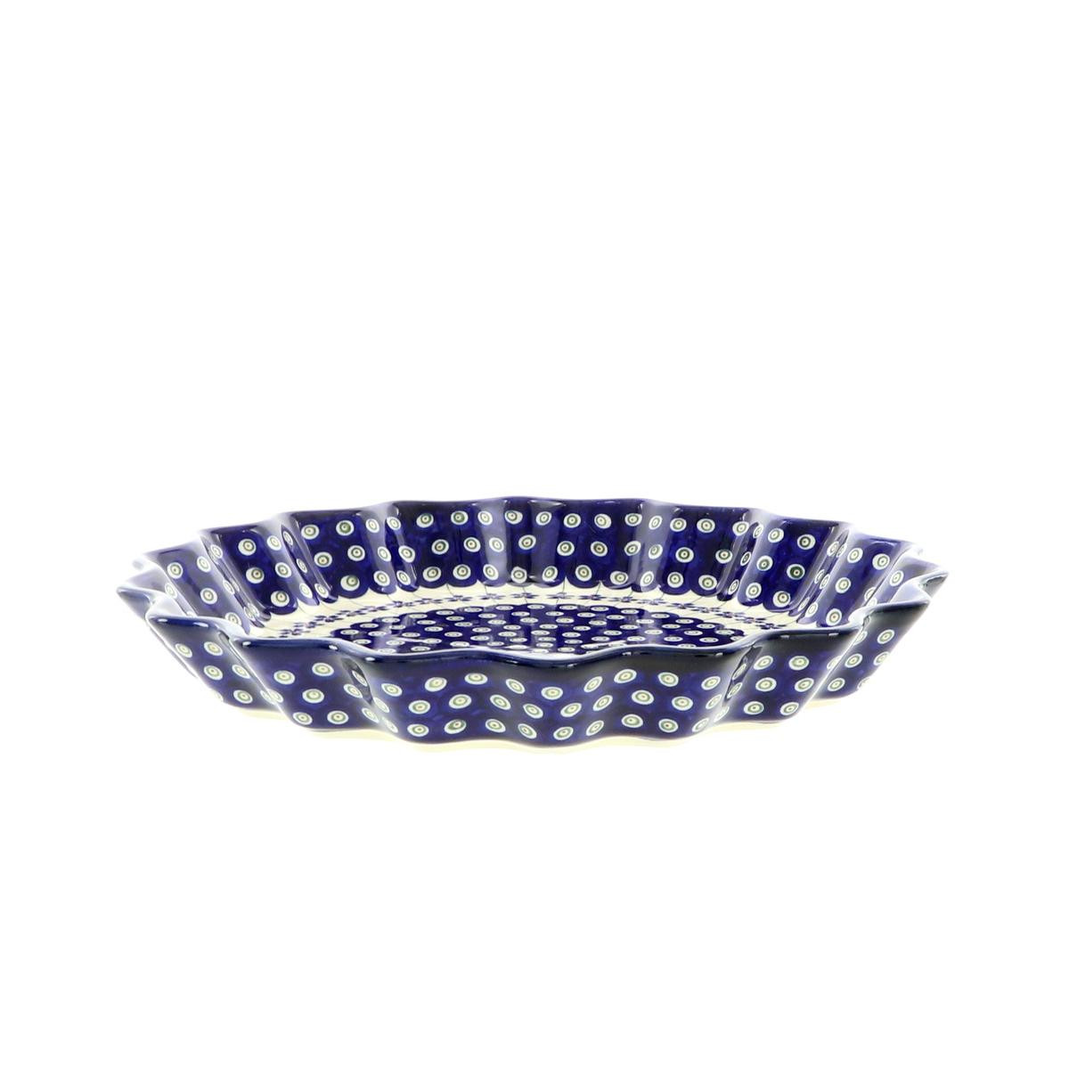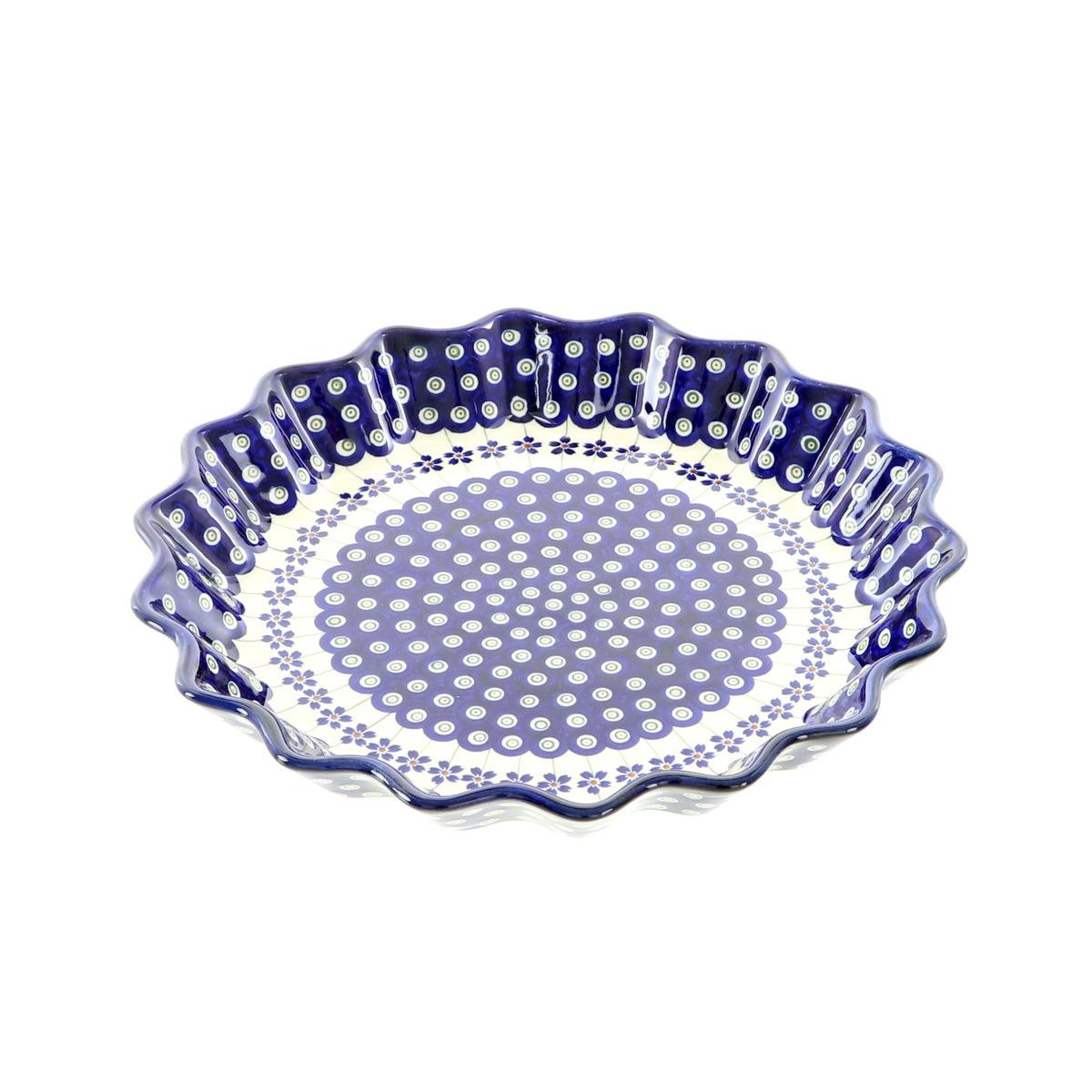 Ceramiczny duży talerz do zapiekania „słoneczko”, dekorowany ręcznie metodą stempelkową motywem w barwach kobaltu i błękitu.