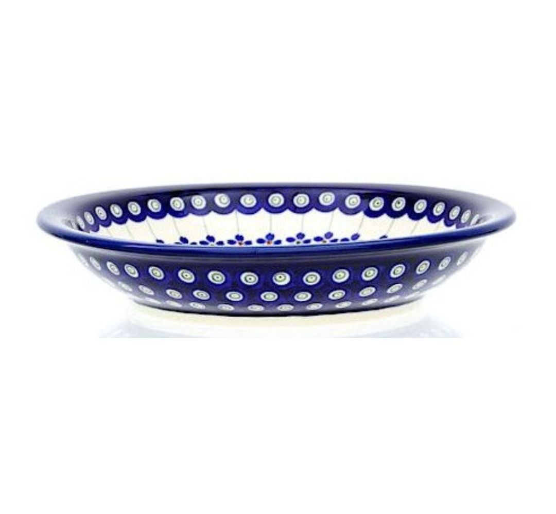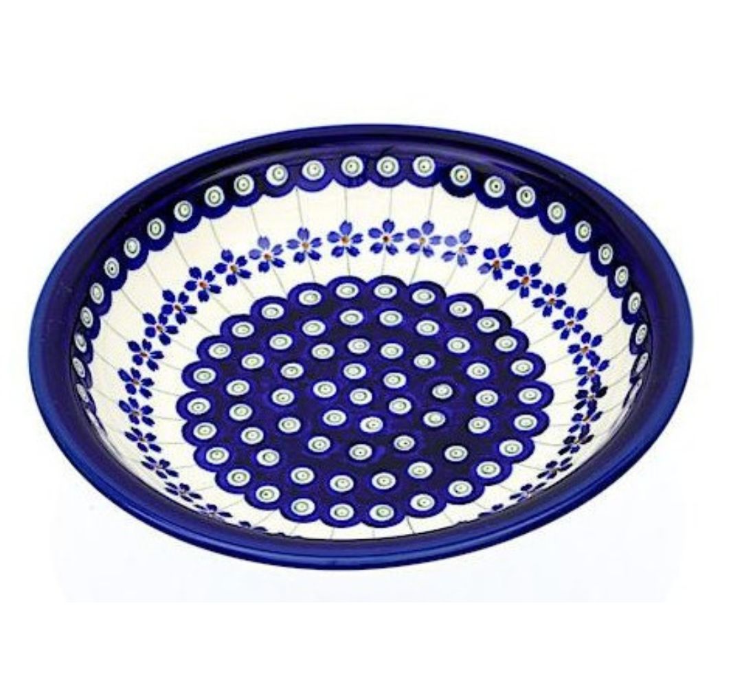 Ceramiczny talerz głęboki o średnicy 22,5 cm. Nadaje się do serwowania każdego rodzaju zup jak również makaronów z sosami. Dekorowany ręcznie metodą stempelkową motywem w barwach kobaltu i błękitu.