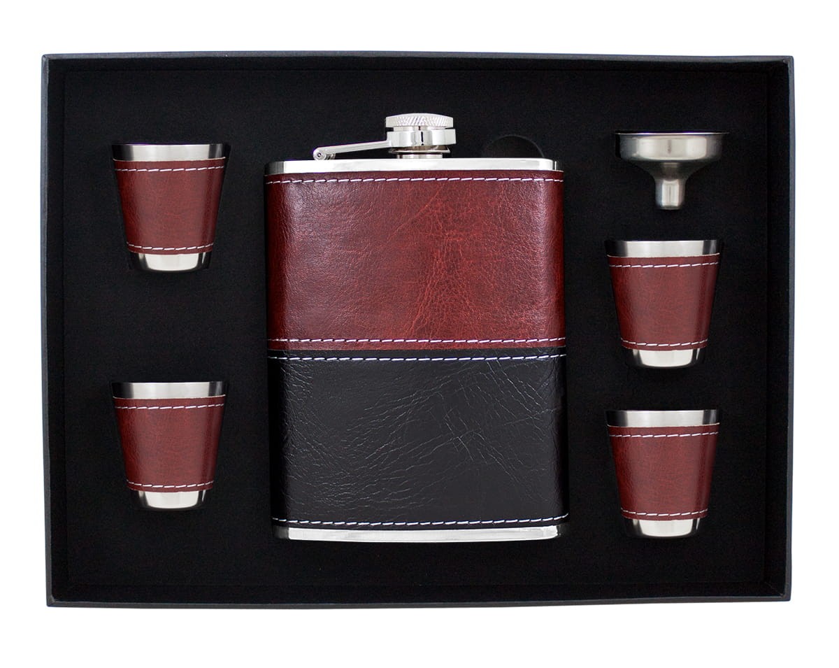 Sześcioczęściowy zestaw zawierający piersiówkę, o pojemności 240 ml, wykonaną ze stali szlachetnej, cztery kieliszki oraz lejek. Piersiówka oprawiona w brązowa eko-skórę do graweru. Zestaw zapakowany w ozdobne pudełko z tasiemką.