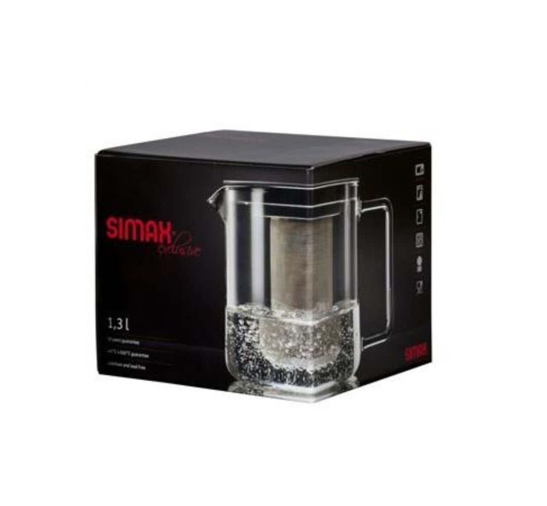 Szkło SIMAX posiada dużą odporność na czynniki chemiczne; jest gładkie i nieporowate, idealnie przezroczyste oraz odporne na korozję. Dzbanek ma pojemność 1,3L, nadaje się idealnie do herbaty, kawy oraz innych gorących napojów. Dzbanek posiada specjalny metalowy filtr do zaparzania herbaty np. liściastej.