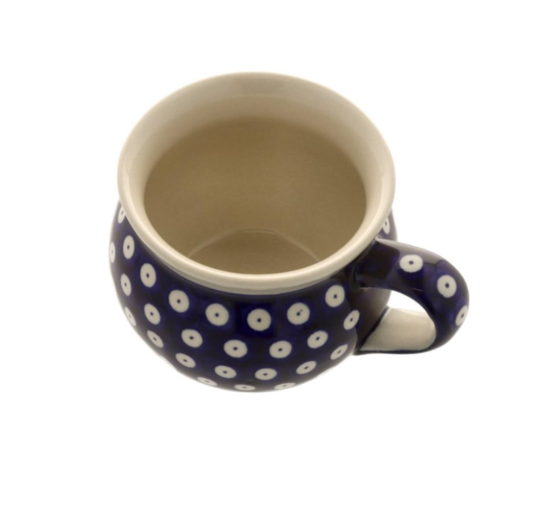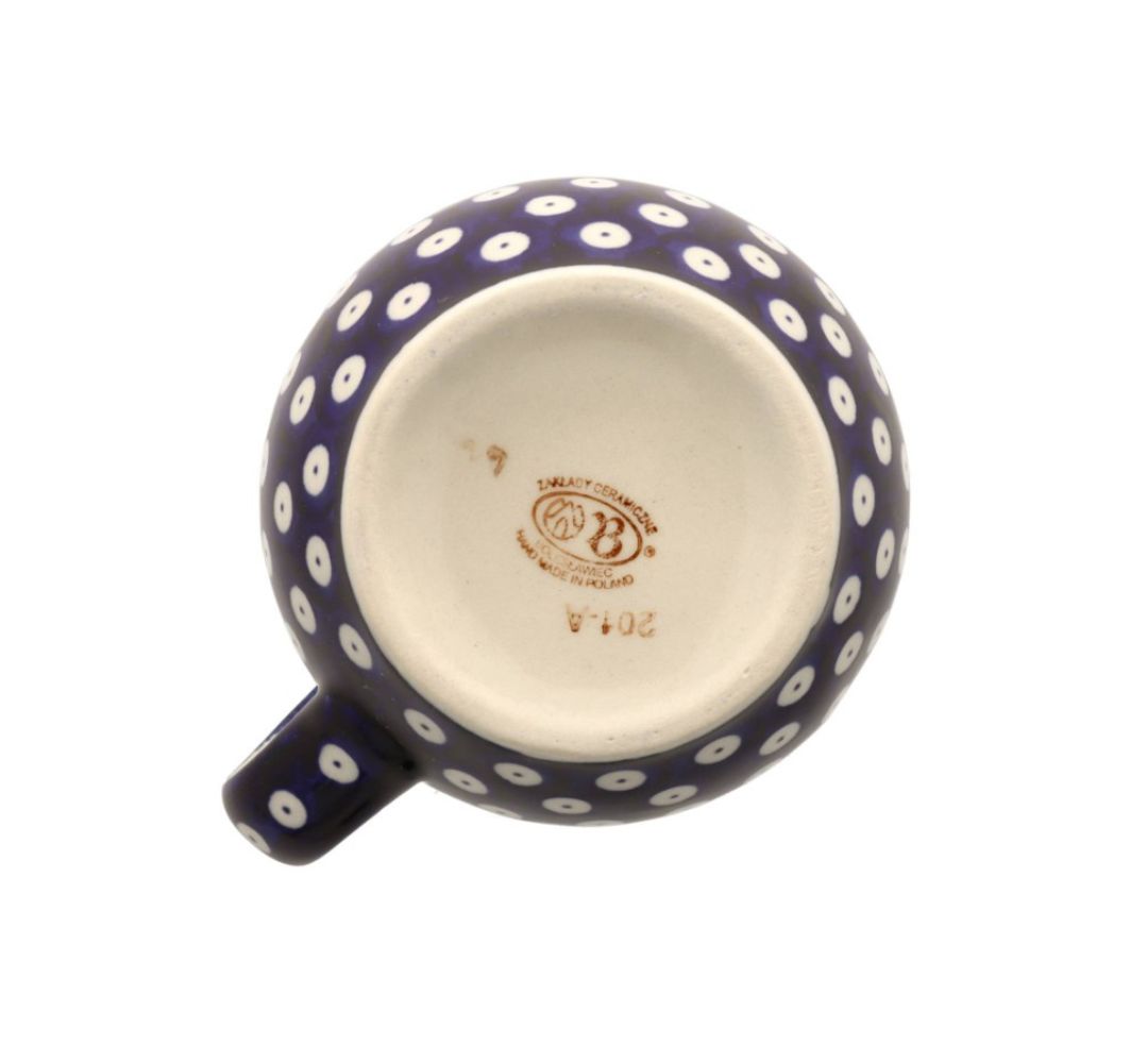 Ceramiczny kubek beczułka o pojemności 420 ml, dekorowany ręcznie metodą stempelkową, motywem w kolorach kobaltu.