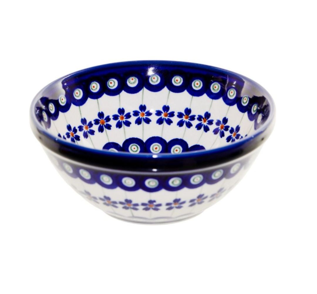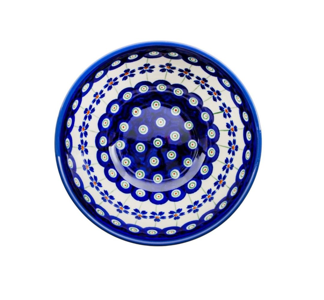 Ceramiczna miska, salaterka o pojemności 500 ml i średnicy 17 cm, dekorowana ręcznie metodą stempelkową motywem w barwach kobaltu i błękitu. Miseczka idealna będzie do zupy, na sałatki, surówki oraz przekąski.