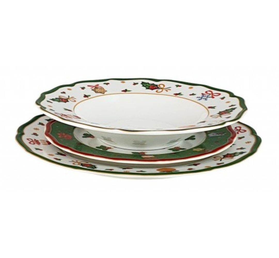 Porcelana „Cicha Noc” przyciąga wzrok z subtelną elegancją — motywy świąteczne, gwiazdki czy delikatne akcenty kolorystyczne współgrają z klasyczną formą naczyń. To kolekcja, która nie dominuje, ale subtelnie oplata stół świąteczną opowieścią.
