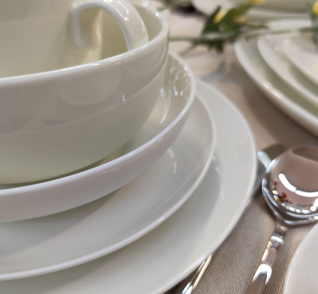 Gładka, lśniąca powierzchnia porcelany podkreśla jej wysoką jakość i doskonale komponuje się z innymi dekoracjami marki Bogucice. Serwis obiadowy Base Cream to porcelana odporna na intensywne użytkowanie, przystosowana do mycia w zmywarce oraz użycia w kuchence mikrofalowej dzięki temu idealnie sprawdzi się w gastronomii jak i w domowych warunkach.