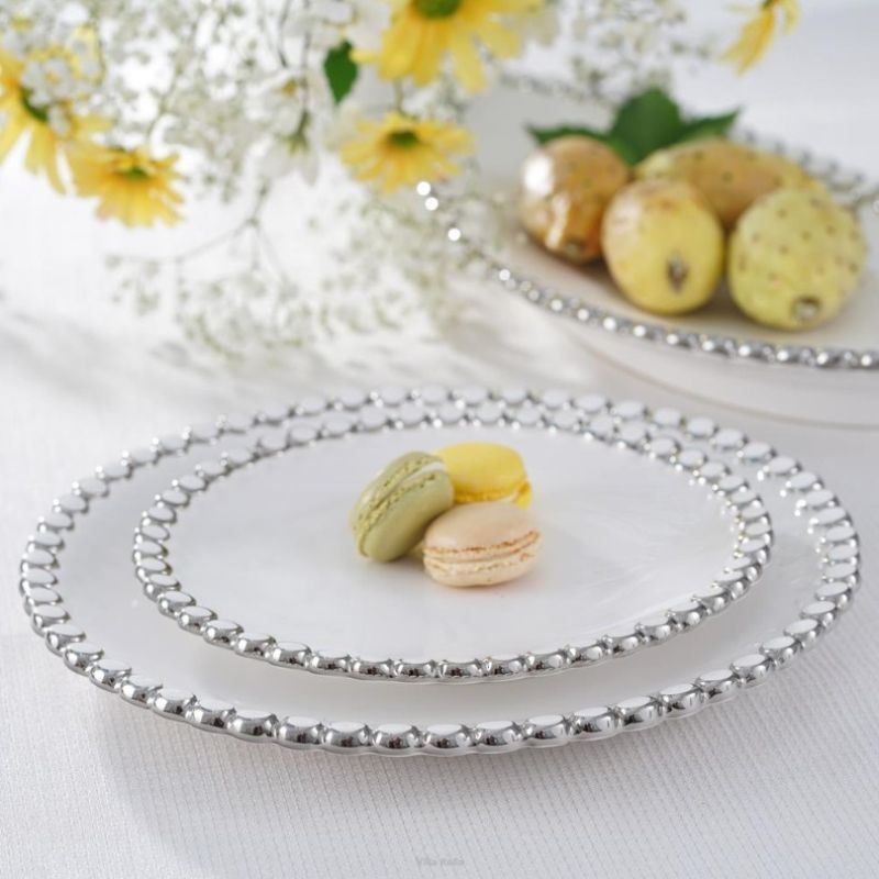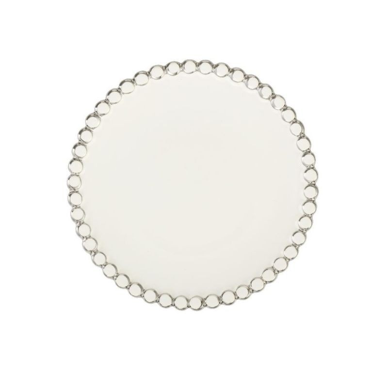 Biały talerzyk deserowy o średnicy 21 cm. Pochodzi z kolekcji CHANTAL obejmującej dekoracyjne naczynia, które wyróżniają się elegancją i oryginalnym wzornictwem. Naczynia wykonane z ceramiki zdobione są tytanem. Ten metal szlachetny charakteryzuje się wyjątkową trwałością, wytrzymałością mechaniczną, lekkością i dobrą odpornością na działanie chloru i rozcieńczonych kwasów.