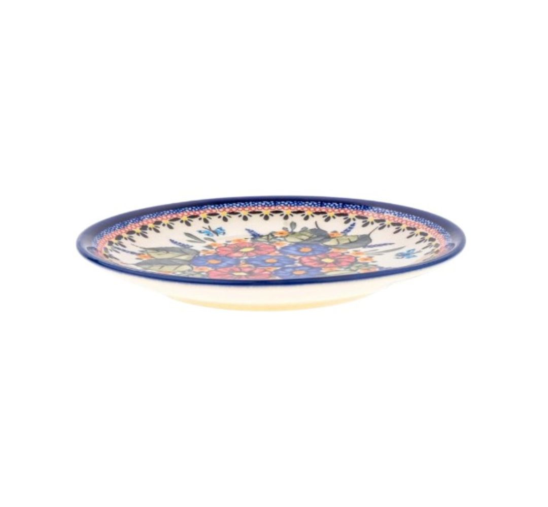 Ceramiczny talerz śniadaniowo-deserowy o średnicy 19,5 cm, dekorowany sielskim motywem fiołków.