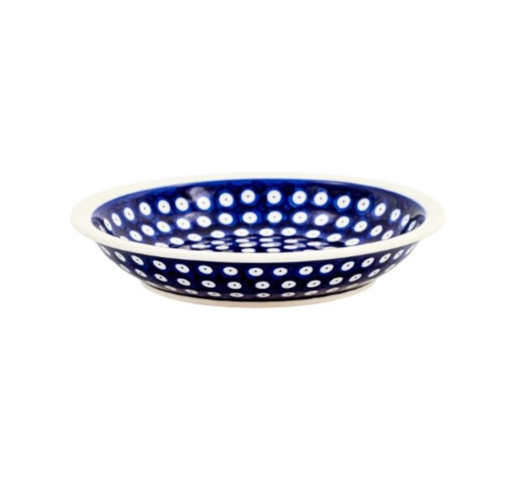 Ceramiczny talerz głęboki o średnicy 22,5 cm, dekorowany w kółka z białymi środkami z kobaltowymi kropeczkami w środku, których obrzeża zlewają się w chmurkę.